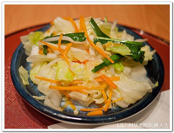 半圓形的盤子隨著餐點與餐具一起端上,溫野菜只用少許的鹽與麻油調味,有高麗菜、紅蘿蔔、豆芽菜與韭菜,口感相當清爽。